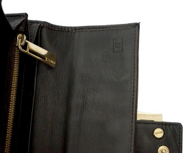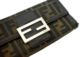 Fendi, portafoglio in tela marrone con monogram ed inserti in pelle, cm 10x19, n.di serie 249757, (segni di utilizzo).