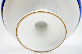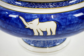Grande vaso in ceramica smaltata bianca e blu a decoro di elefanti, profili dorati, firmato Tadini, cm h 29, diam. cm 40.