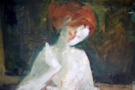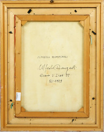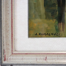 Interno con figura femminile, olio su tela, cm 70x50, firmato Alfredo Romagnoli, entro cornice