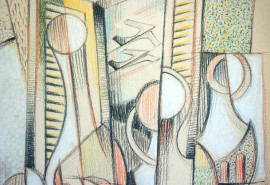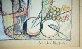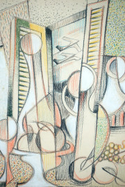 Leandra Mattioli (XX sec.), Composizione cubo-futurista con frutta, vasellame ed aerei, matite grasse su carta, cm 29x22, firmato