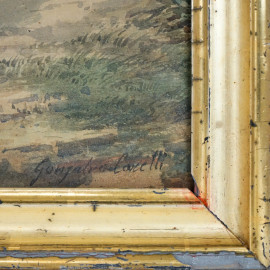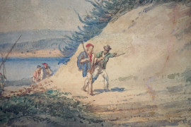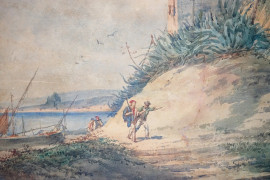 Lido con pescatori, acquarello su carta, cm 30x44, firmato, entro cornice.