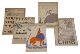 Lotto composto da cinque locandine dei primi del Novecento con stampa fronte e retro di pubblicità d’epoca, ciascuna circa cm 23x18