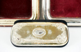 Lotto composto da tre oggetti con finiture in argento, misure max cm 3,5x22x17,(difetti)