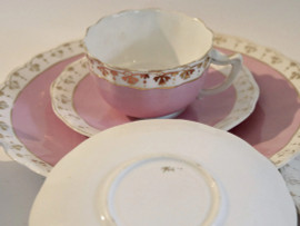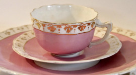 Lotto composto da tre piattini, due tazze da the e un piatto in porcellana decorata in oro, datato 1964