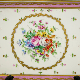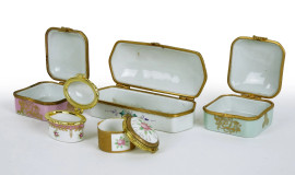 Lotto composto da un vassoio e cinque scatoline in porcellana policroma, decori floreali, misure max cm 36x15, manifatture diverse, XX secolo, (difetti).