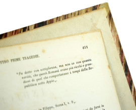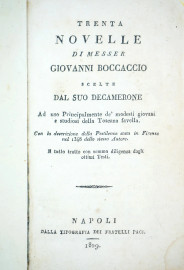 Lotto di due volumi: "Trenta novelle di Messer Giovanni Boccaccio scelte dal suo Decamerone […]", Napoli, dalla tipografia dei fratelli Paci, 1829; "Tragedie di Vittorio Alfieri coi pareri dell'autore, del Casalbigi e del Cesarotti intorno alle stesse", Trieste, 1857, (macchie e difetti sulla carta). [..]