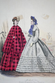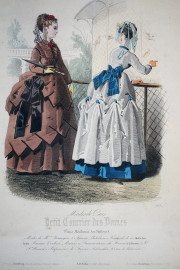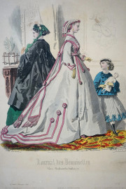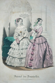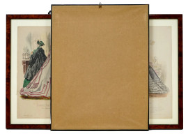 Lotto di quattro stampe acquerellate raffiguranti donne in abiti alla moda, misure max cm 27x19,5, XIX secolo, (difetti sulla carta).