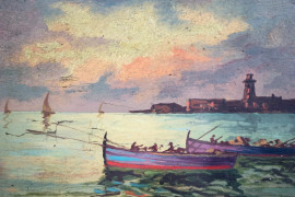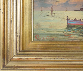 Marina con imbarcazioni, olio su tavola, cm 15x21, firmato e datato, entro cornice.