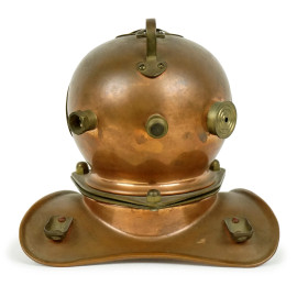 Modello di casco da palombaro in rame con particolari in ottone, XX secolo, cm h 20, (difetti).