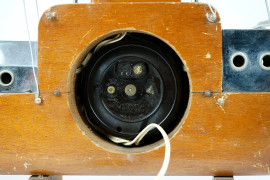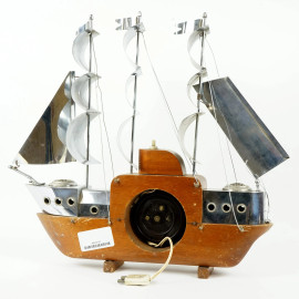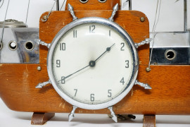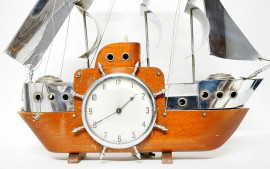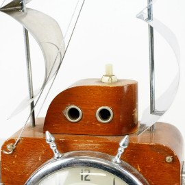 Orologio da tavolo a forma di nave in legno e metallo cromato, quadrante a numeri arabi, seconda metà XX secolo, cm h 42, (meccanismo da revisionare).