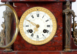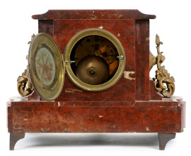 Orologio da tavolo in marmo rosso, XIX secolo, quadrante circolare a numeri romani, finiture e applicazioni in bronzo dorate, piedini anteriori ferini, cm h 23x34x19, (difetti, mancanze, meccanismo da revisionare)