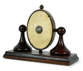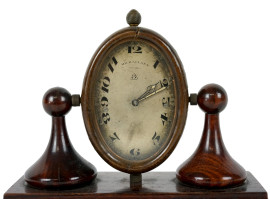 Orologio da tavolo in noce, quadrante ovale a numeri arabi, cm 13,5x17x7, (difetti, meccanismo da revisionare)