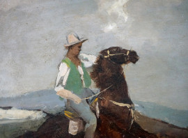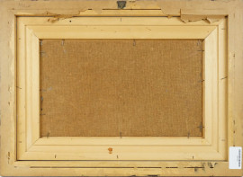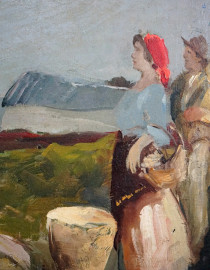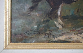 Paesaggio con cavaliere e contadini, olio su faesite, cm 25x43, firmato, entro cornice.