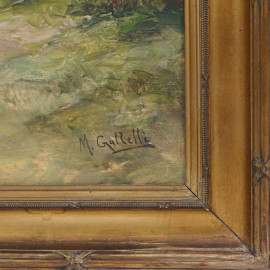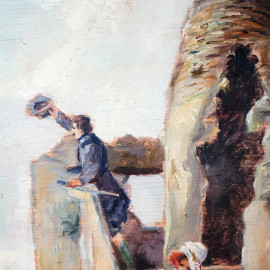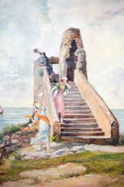 Paesaggio con rovine e figure, olio su compensato, cm 70x50, firmato M.Gallelli, entro cornice.