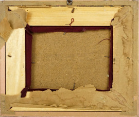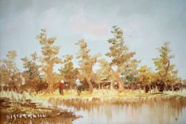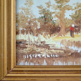 Paesaggio lacustre con figure, olio su cartone, cm 15x20, firmato, entro cornice.