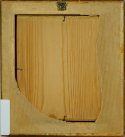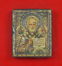 Piccola icona raffigurante San Nicola, placca in metallo dorato, cm 6,5x5,5, XX secolo, entro cornice