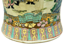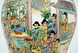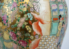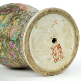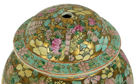 Potiche in porcellana policroma, Cina, XX secolo, cm h35, (coperchio incollato, presenti fori per trasformazione a lampada)