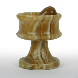 Quattro calici ed un mortaio con pestello in onice, XX secolo, cm h 11, (difetti)