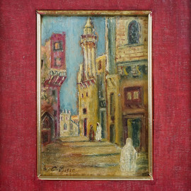 Scorcio di città araba, olio su tavola, cm 13x9, firmato, entro cornice.