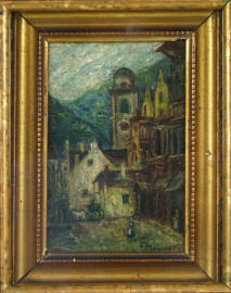 Scorcio di paese alpino, olio su tavola, cm 13x9, firmato, entro cornice.