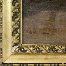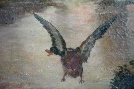 Scorcio palustre con anatre, olio su tela riportata su masonite, cm 30x43, firmato, entro cornice.