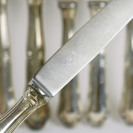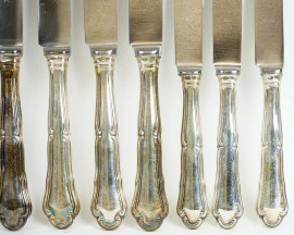 Sei coltelli da portata e sei coltelli da dolce con manici in argento, XX secolo.