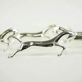 Sei segnaposto a forma di cavalli in metallo argentato, lunghezza cm 8, XX secolo.