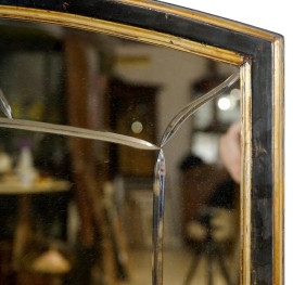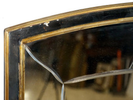 Specchiera di linea sagomata in legno ebanizzato e dorato, XX secolo, specchio molato, misure ingombro cm 102x72,5, (difetti).