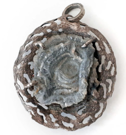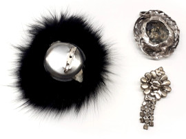 Tre spille vintage: spilla vintage in metallo dorato e perle; spilla vintage in metallo dorato e motivi floreali in pietra dura; spilla vintage in metallo argentato con rara pietra fossile incastonata