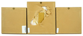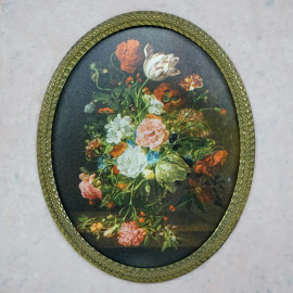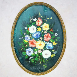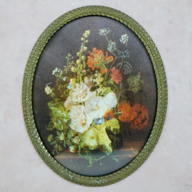 Vasi con fiori, olio su cartoncino e due stampe a colori, misure max cm 12,5x9, XX secolo, entro cornici, (lievi difetti).