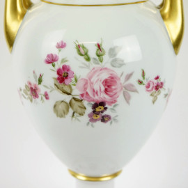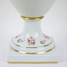 Vaso in porcellana bianca, decoro a motivi floreali, prese e particolari dorati, traforo per lampada, cm h 39, marcato Bavaria sotto la base, (difetti).