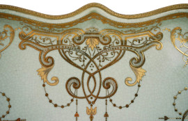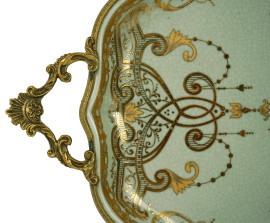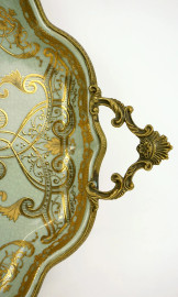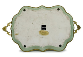 Vassoio di linea sagomata in porcellana verde con decori dorati, bordo e prese laterali in metallo dorato, cm 45x26,5, XX secolo