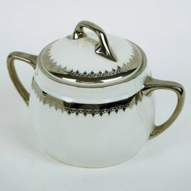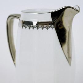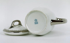 Zuccheriera e lattiera in porcellana bianca con decori argentati, marca sotto la base, alt. max cm 14