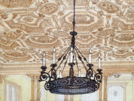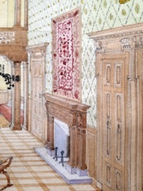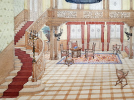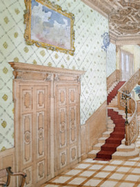 Acquarellista della fine del XIX secolo, Dipinto ad acquarello su carta raffigurante interno di dimora nobiliare, cm 50x60