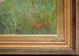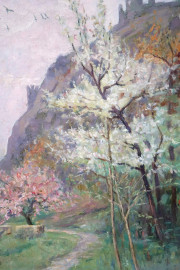 Alberi in fiore, olio su cartone, cm 59x30, firmato, entro cornice.