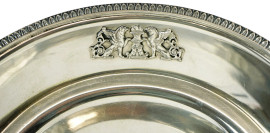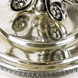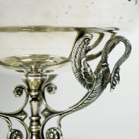 Alzata centrotavola in argento, coppa con decoro di grifoni e bracieri, sorretta da tre cigni poggianti su base circolare con particolari cesellati, alt. cm 15, diam. cm 24, XX secolo, peso gr. 1070