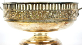 Alzatina traforata in metallo argentato, decori a sbalzo raffiguranti uccellini, fiori e frutti, vasca interna in vetro, metà XX secolo, cm h 23x20,5x16, (difetti)
