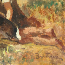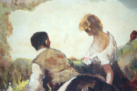 Amanti, olio su compensato, cm 19x27,5, firmato, (difetti).