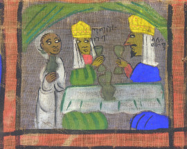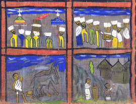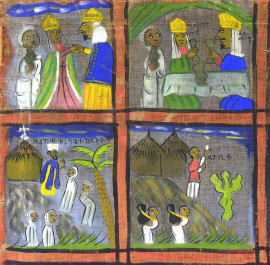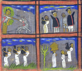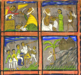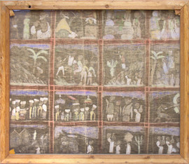 Antica tela dipinta raffigurante scene bibliche suddivise in 16 tavole con testi in lingua ebraica, cm 90x105, fine XIX sec