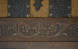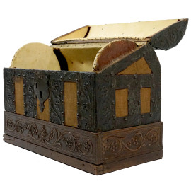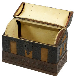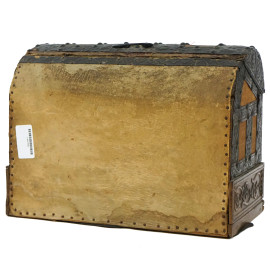 Antico bauletto da viaggio, rivestito in tessuto e lamina di ferro sbalzata e cesellata, ad un cassetto con particolari scolpiti, cm h 30x40x21, (difetti).