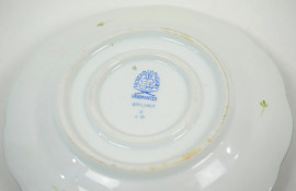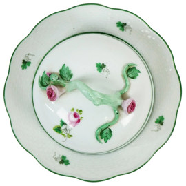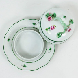 Burriera in porcellana policroma, XX secolo, decoro e presa a ramages e fiori, cm h 10x15, marchio Herend sotto la base, (lievi difetti).