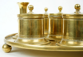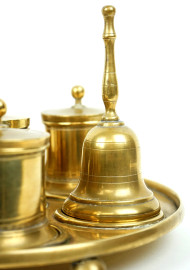 Calamaio in ottone di linea circolare, con cinque bocce da inchiostro ed un campanello, cm h 16x23, XX secolo.
