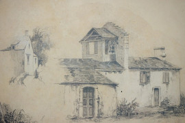 Casale con chiesa, disegno a matita su carta, cm 15X20, firmato A.Fontanesi, entro cornice.