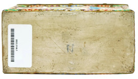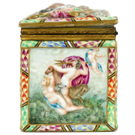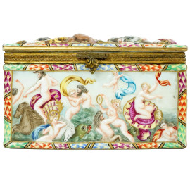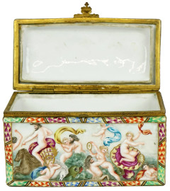 Cofanetto in porcellana Capodimonte con decori policromi modellati a rilievo raffiguranti scena di battaglia e Trionfo di Venere, finiture in bronzo, cm h 10x17,5x8,5, marcato sotto la base, (difetti).