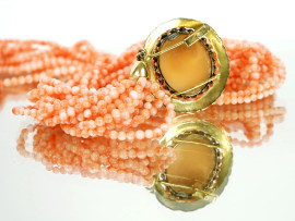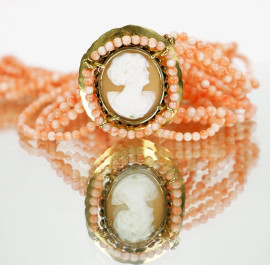 Collana a 14 fili in corallo rosa con ciondolo a cammeo raffigurante profilo di donna, montatura e chiusura in oro 18 kt, peso totale gr. 102,9
