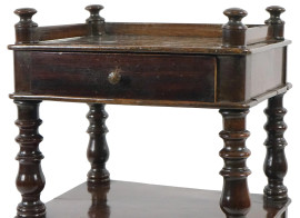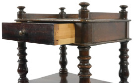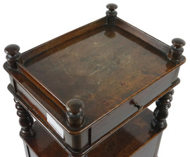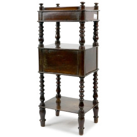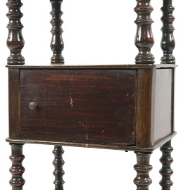 Comodino in noce, metà XX secolo, a tre ripiani, fronte ad un cassetto ed uno sportello, quattro montanti torniti, cm h 87,5x35,5x27, (difetti).