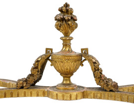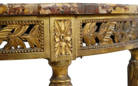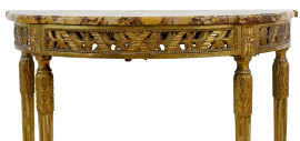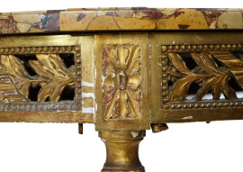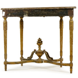Consolle a mezzaluna stile Luigi XVI, in legno scolpito e dorato, piano in marmo, poggiante su quattro gambe scanalate riunite da traversa con vaso e bouquet di fiori, cm h 93x106,5x48,5, XIX secolo, (difetti).