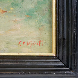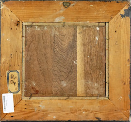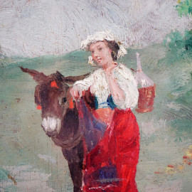 Contadina con asinello, olio su tavola, cm 21x24, firmato, entro cornice.