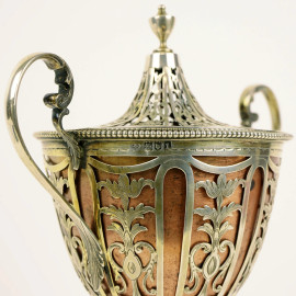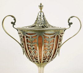 Coppa con coperchio in argento, bolli Inghilterra, XIX secolo, corpo traforato con decori incisi e cesellati, due prese laterali a volute, cm h 23, peso gr. 465, (la vasca interna presenta piccola ammaccatura)