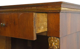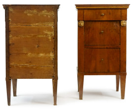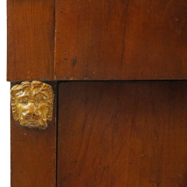 Coppia di comodini Impero in noce, seconda metà del XIX secolo, fronte a tre cassetti, teste leonine e finiture dorate, quattro gambe troncopiramidali, cm h 88,5x50,5x40,5, (difetti).